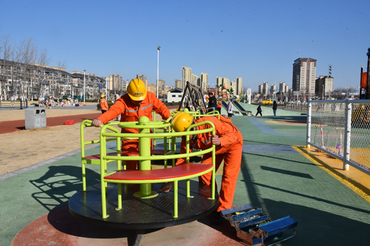 在公園廣場里,秩序井然,工作人員一絲不茍地對游樂健身設(shè)施進行全方位檢查,“不遺漏”任何一顆螺絲、一根繩子,確保設(shè)施安全運行,讓市民游客過一個“放心年”。