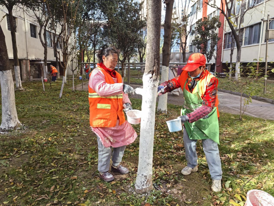 細心的業(yè)主不難發(fā)現,樹木已悄然穿上整齊的“冬裝”。物業(yè)工作人員有條不紊地對喬木根部進行涂白處理。這層白色“防護衣”不僅美觀,更是樹木越冬的“守護者”——它能有效反射部分陽光,減緩樹干因晝夜溫差過大而導致的凍裂風險,同時清除樹皮縫隙中潛藏的害蟲及蟲卵,為來年春季樹木茁壯成長打下堅實基礎。