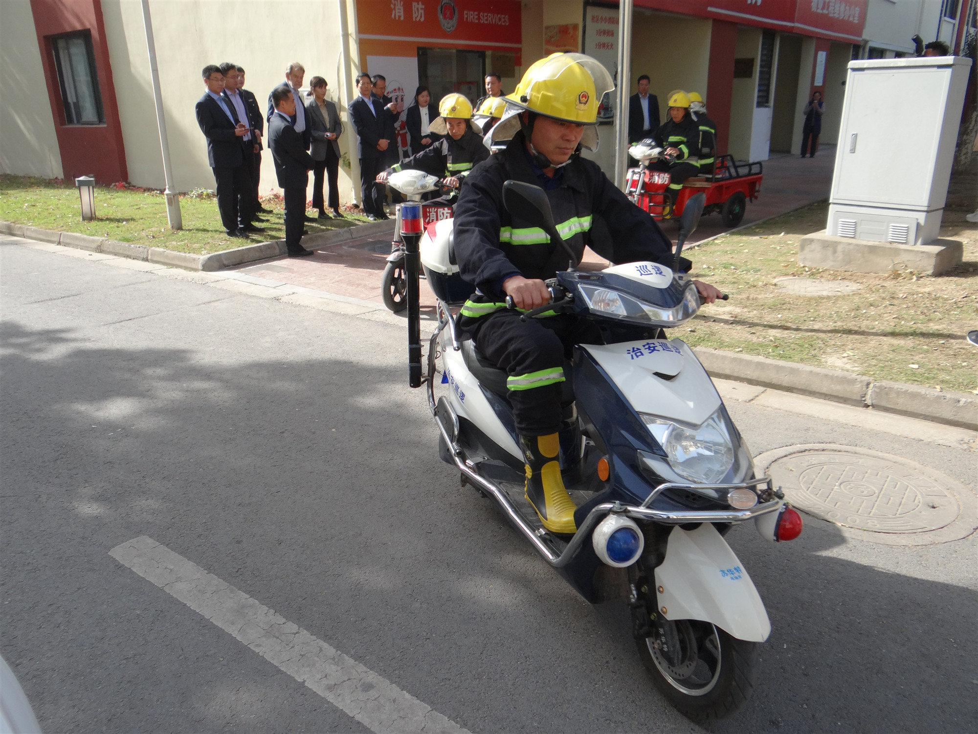 公舍管理人員詳細介紹了安全管理工作開展情況,包括日常巡查、安全知識宣傳及臺賬管理;隨后管理人員帶領檢查組實地查看微型消防站運行情況,重點介紹火災預防和初期火災處理,原則上3分鐘到場,5分鐘滅火,最后組織義務消防員進行實地拉動演練。