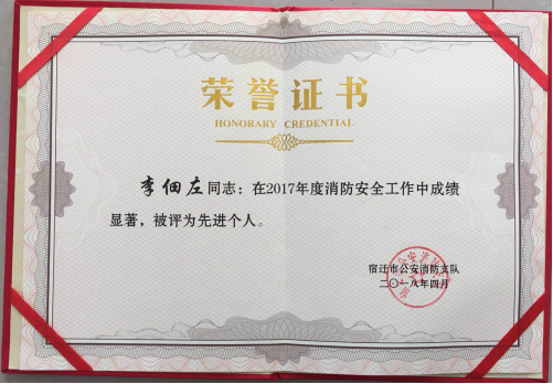 公司安防主管獲“宿遷市消防安全工作先進(jìn)個(gè)人”稱號(hào)