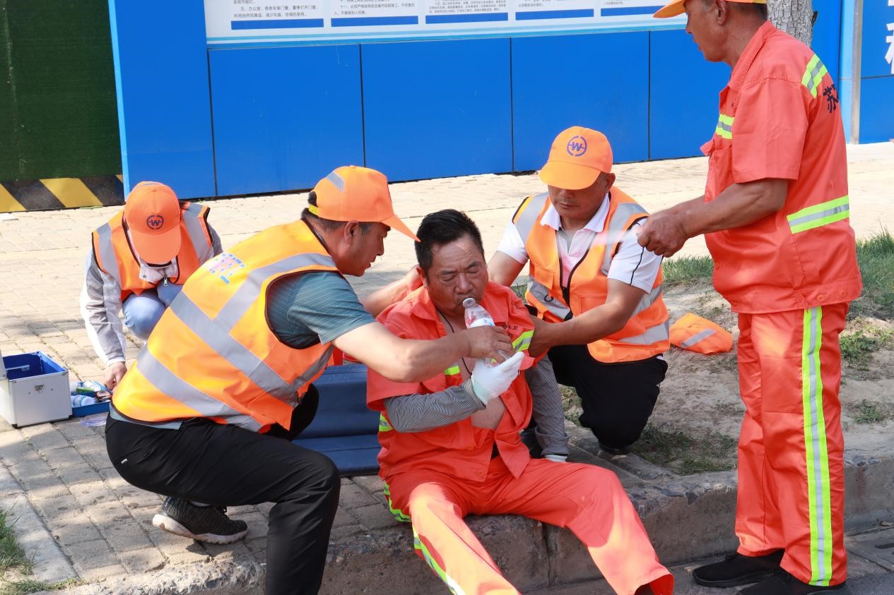 此次演練模擬一名環(huán)衛(wèi)工人在作業(yè)過(guò)程中,突然感到頭暈、心慌乏力,立即向主管人員電話求助。主管人員隨即趕到現(xiàn)場(chǎng)查看情況,發(fā)現(xiàn)環(huán)衛(wèi)工人躺坐在現(xiàn)場(chǎng),面色潮紅、大汗淋漓,精神狀況不佳,系中暑跡象,立即向項(xiàng)目經(jīng)理報(bào)告,聯(lián)系應(yīng)急救援人員,并呼喊附近作業(yè)人員將其攙扶到陰涼處,解開衣扣散熱,應(yīng)急救援人員趕到現(xiàn)場(chǎng)后,立即用濕毛巾、酒精棉擦拭身體,涂上清涼油,喂服藿香正氣水、淡鹽水......,經(jīng)過(guò)初步救護(hù),中暑人員癥狀得以緩解后,隨即將其送往園區(qū)社區(qū)衛(wèi)生服務(wù)中心進(jìn)一步治療。