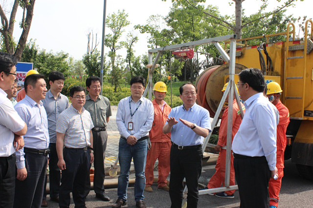 在同里湖路,李榮錦認(rèn)真聽取了園區(qū)城市排水防澇工作進(jìn)展情況匯報,現(xiàn)場查看了管道疏通清淤工作,并詳細(xì)詢問了管道CCTV檢測流程等情況。